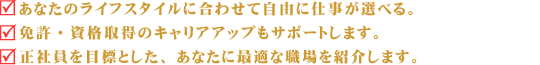 資格、免許取得のスキルアップへのサポートも積極的に行っていますので、ステップアップして専門的な業務に就くことだって夢ではありません。
